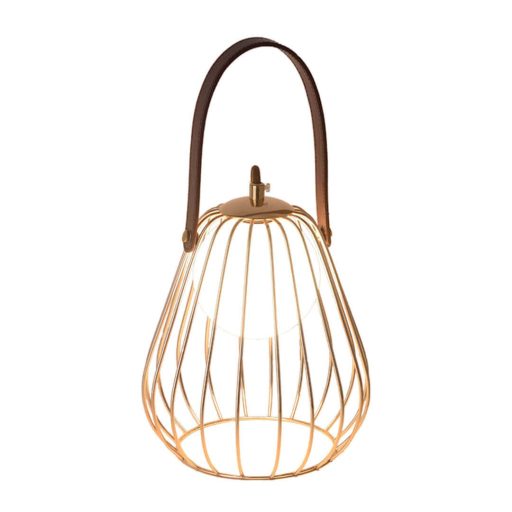 Arany színű fém vázas asztali lámpa kívül fémrács, belül fehér színű üveg búrával PU műbőr dekorral, 1db G9-es foglalattal, vezetékre szerelt kapcsolóval.