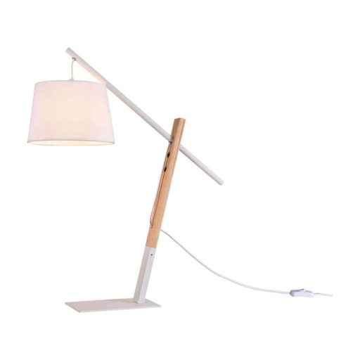 Fehér színű fém és natúr fa vázas asztali lámpa fehér színű textil bevonatos pvc búrával, 1db E27-es foglalattal, vezetékre szerelt kapcsolóval.