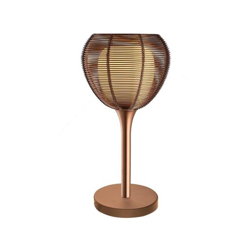 Kávé színű alumínium és fém anyagokból készült asztali lámpa fém hálóval körül ölelt, fehér színű üveg búrával, 1db E14-es foglalattal, vezetékre szerelt kapcsolóval.