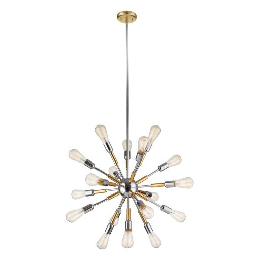 Króm és arany színű fém függesztett, búra nélküli lámpa 18db E27-es foglalattal. A lámpa dekor fényforrással, vintage vagy nagygömb fényforrással mutat a legjobban, ami külön vásárolható.