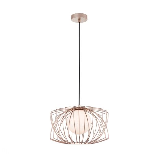 Rózsaarany színű fém vázas függesztett lámpa fémrács keretes, fehér színű üveg búrával, 1db G9-es foglalattal.