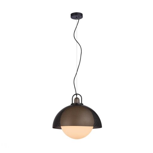 Fekete színű fém vázas függesztett lámpa lyuggatott fém és fehér színű üveg búrával, 1db E27-es foglalattal.