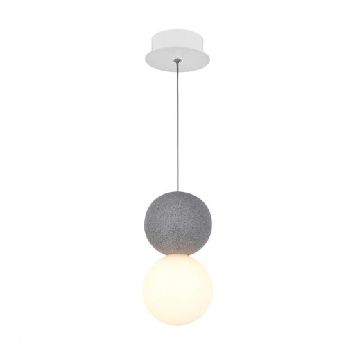 Fehér színű fém vázas függesztett lámpa szürke színű beton golyó dekorral, alatta fehér színű üveggömb búrával, 1db G9-es foglalattal.
