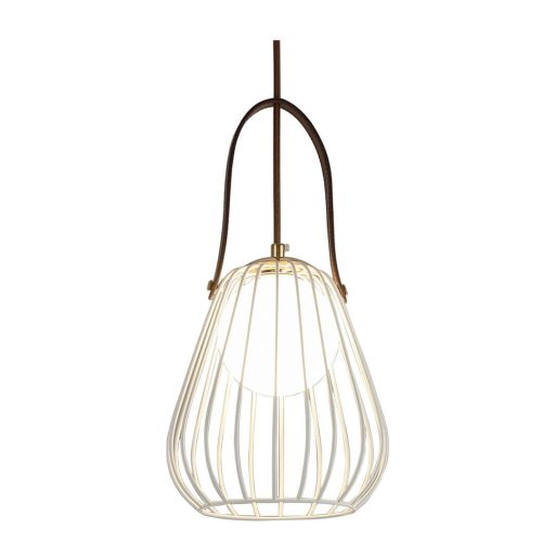 Fehér színű fém vázas függeszett lámpa kívül fémrács, belül fehér színű üveg búrával PU műbőr dekorral, 1db G9-es foglalattal.