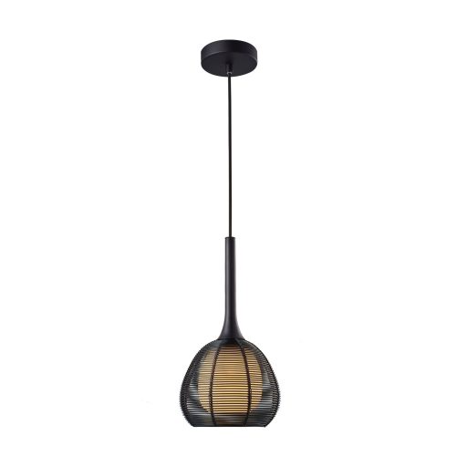 Fekete színű alumínium és fém anyagokból készült függesztett lámpa fém hálóval körül ölelt, fehér színű üveg búrával, 1db E14-es foglalattal.