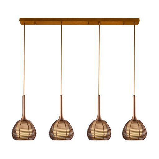 Kávé színű alumínium és fém anyagokból készült függesztett lámpa fém hálóval körül ölelt, fehér színű üveg búrával, 4db E14-es foglalattal.