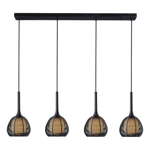 Fekete színű alumínium és fém anyagokból készült függesztett lámpa fém hálóval körül ölelt, fehér színű üveg búrával, 4db E14-es foglalattal.