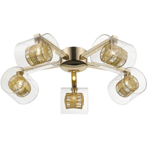 Arany színű fém vázas mennyezeti lámpa belül fémdrót dekoros, kívül átlátszó üveg búrával, 5db G9-es foglalattal.