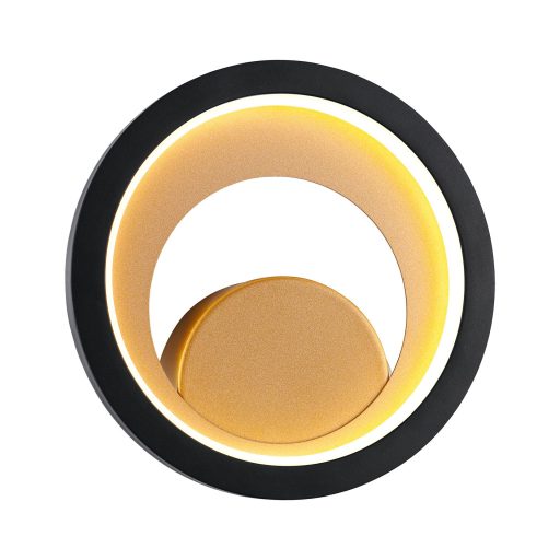Fekete és arany színű fém fali lámpa fehér műanyag betéttel, meleg fehér színhőmérsékletű beépített LED fényforrással.