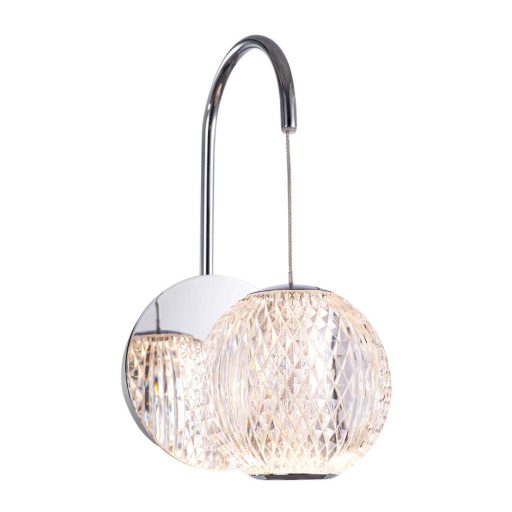 Króm színű fém vázas fali lámpa átlátszó, díszes acryl búrával, meleg fehér színhőmérsékletű beépített LED fényforrással.