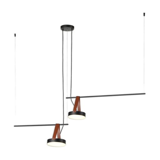 Fekete színű fém vázas függeszett lámpa fehér színű acryl búrával, PU műbőr dekorral, meleg fehér színhőmérsékletű beépített LED fényforrással.