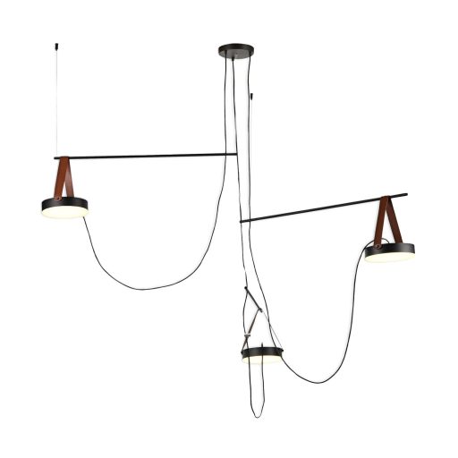 Fekete színű fém vázas függeszett lámpa fehér színű acryl búrával, PU műbőr dekorral, meleg fehér színhőmérsékletű beépített LED fényforrással.