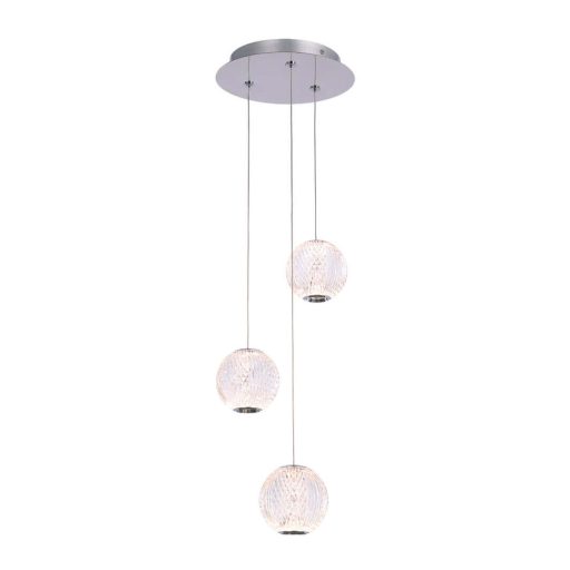 Króm színű fém vázas függesztett lámpa 3db átlátszó, díszes acryl búrával, meleg fehér színhőmérsékletű beépített LED fényforrással.