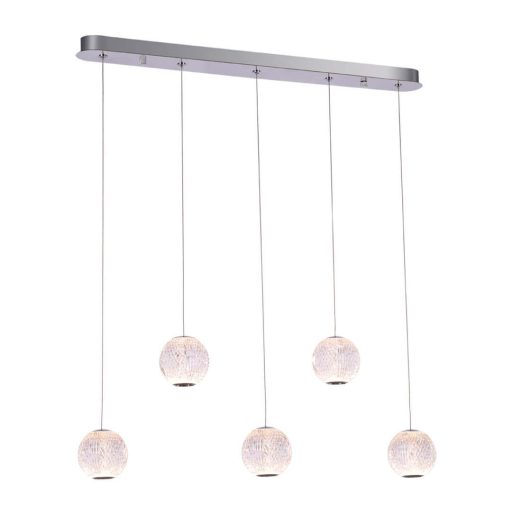 Króm színű fém vázas függesztett lámpa 5db átlátszó, díszes acryl búrával, meleg fehér színhőmérsékletű beépített LED fényforrással.