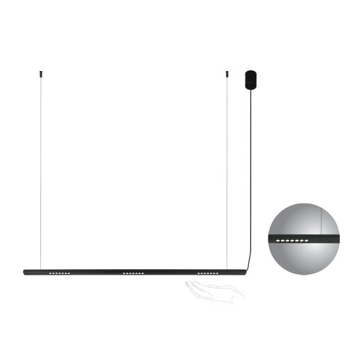 Fekete színű alumínium függesztett lámpa 120cm hosszú, műanyag betétes búrával, felületre szerelhető mennyezet rózsával, természetes fehér színhőmérsékletű beépített LED fényforrással. A lámpa fényereje a búra alatti kézmozdulattal szabályozható.