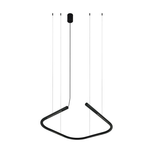 Fekete színű alumínium függesztett lámpa 75x75cm széles, műanyag betétes búrával, felületre szerelhető mennyezet rózsával, természetes fehér színhőmérsékletű beépített LED fényforrással. A lámpa fényereje a búra alatti kézmozdulattal szabályozható.