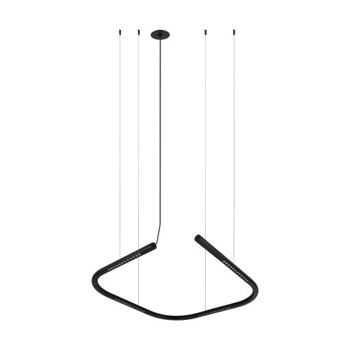 Fekete színű alumínium függesztett lámpa 75x75cm széles, műanyag betétes búrával, mennyezetbe építhető mennyezet rózsával, természetes fehér színhőmérsékletű beépített LED fényforrással. A lámpa fényereje a búra alatti kézmozdulattal szabályozható.