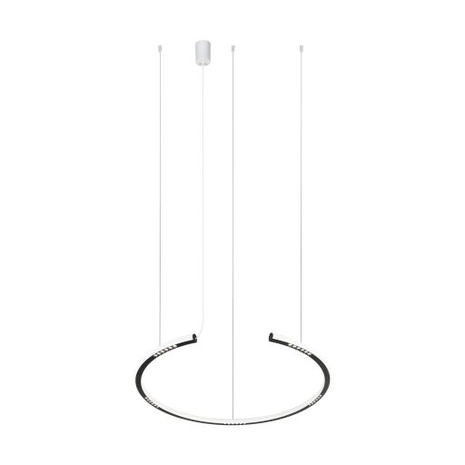Fehér színű alumínium függesztett lámpa 80cm átérőjű, műanyag betétes búrával, felületre szerelhető mennyezet rózsával, természetes fehér színhőmérsékletű beépített LED fényforrással. A lámpa fényereje a búra alatti kézmozdulattal szabályozható.