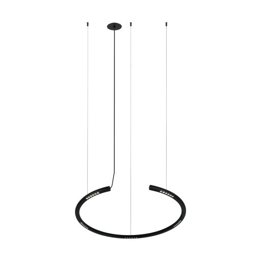 Fekete színű alumínium függesztett lámpa 80cm átérőjű, műanyag betétes búrával, mennyezetbe építhető mennyezet rózsával, természetes fehér színhőmérsékletű beépített LED fényforrással. A lámpa fényereje a búra alatti kézmozdulattal szabályozható.