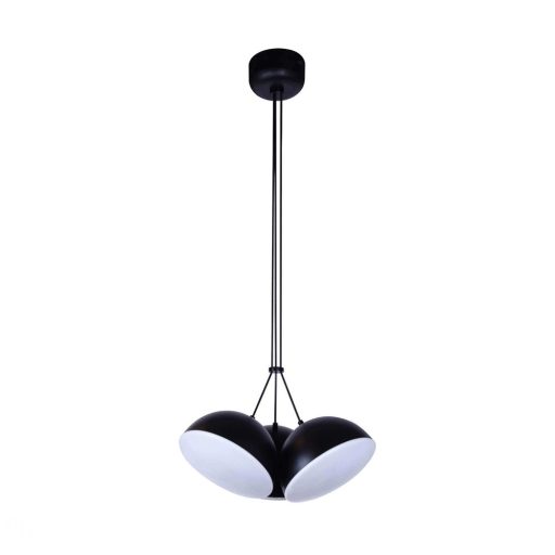 Fekete színű fém vázas függesztett lámpa üveg betétes búrával, természetes fehér színhőmérsékletú beépített LED fényforrással. A lámpa feje állítható.