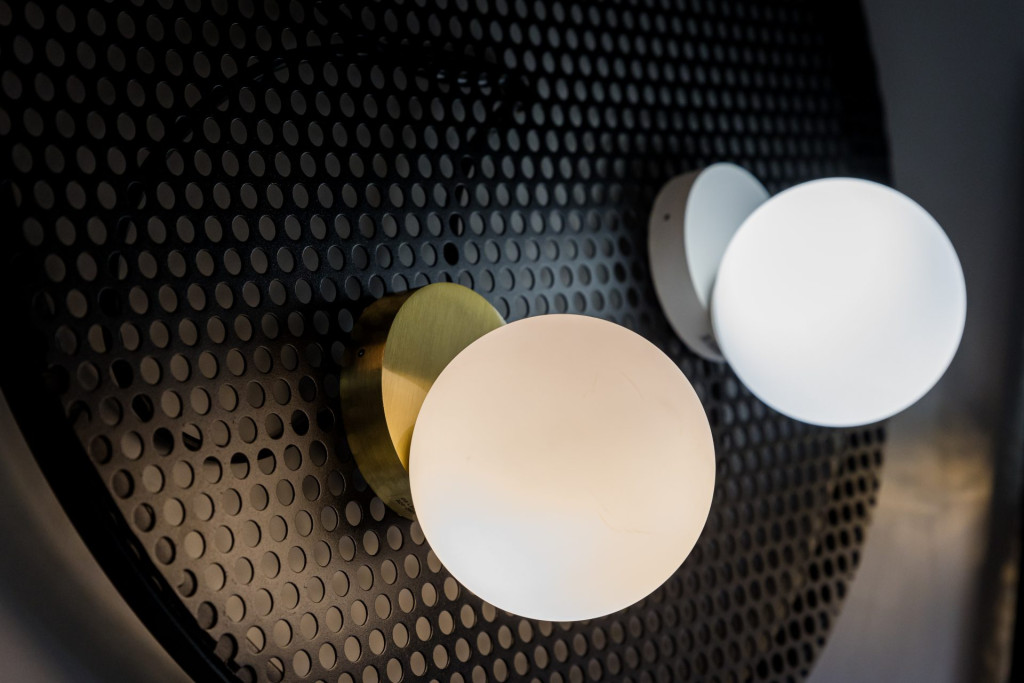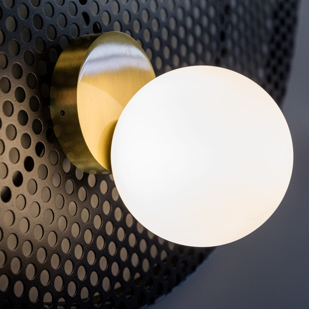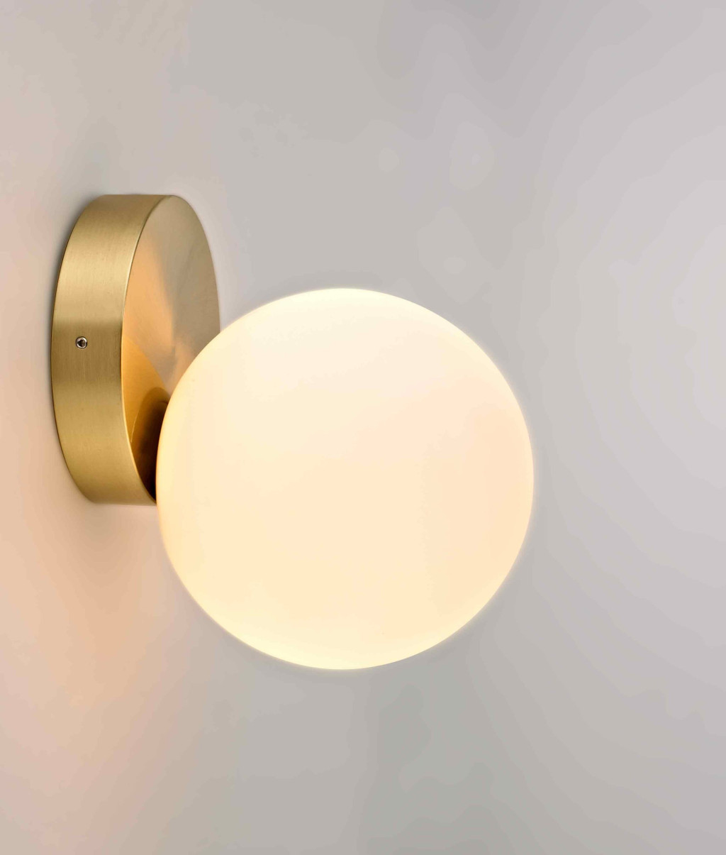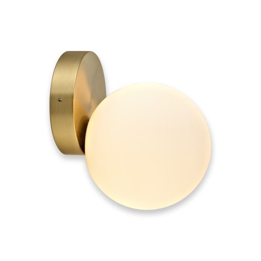 Sárgaréz színű fém fali lámpa fehér üveg gömb búrával, 1db G9-es foglalattal, IP44-es védelemmel.