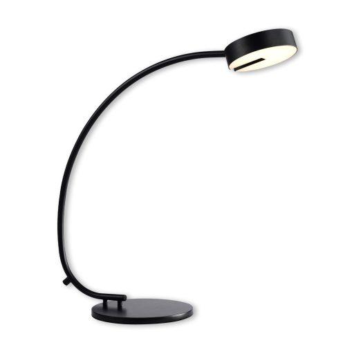 Fekete színű fém asztali lámpa fehér acryl betétes, billenthető búrával, meleg fehér színhőmérsékletű beépített LED fényforrással, vezetékre szerelt kapcsolóval.