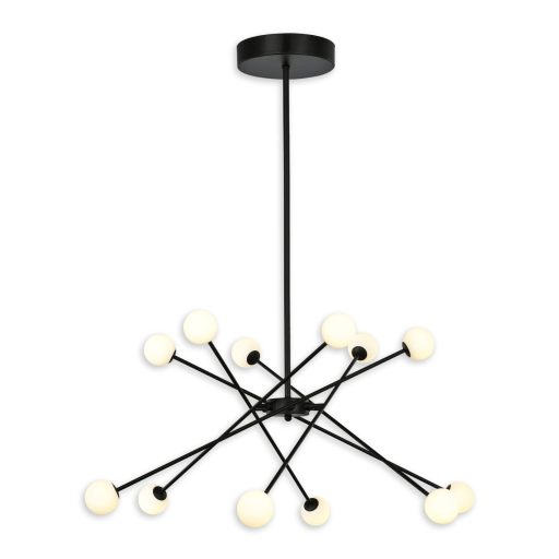 Fekete színű fém függeszett lámpa fehér színű üveggömb búrákkal, beépített, meleg fehér színhőmérsékletű LED fényforrással.