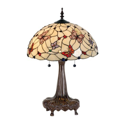 Bronzos barna színű polyresin vázas komód lámpa 48cm átmérőjű pillangó dekoros, bézses árnyalatú alapon színes pillangós Tiffany üveg búrával, húzókapcsolóval. A lámpában 2 db külön kapcsolható E27-es foglalat található.