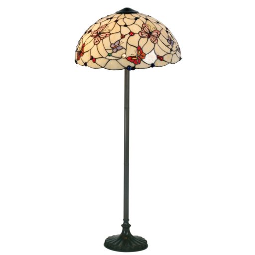 Bronzos barna színű polyresin vázas álló lámpa 48cm átmérőjű pillangó dekoros, bézses árnyalatú alapon színes pillangós Tiffany üveg búrával, vezetékre szerelt kapcsolóval. A lámpában két db E27-es foglalat található.
