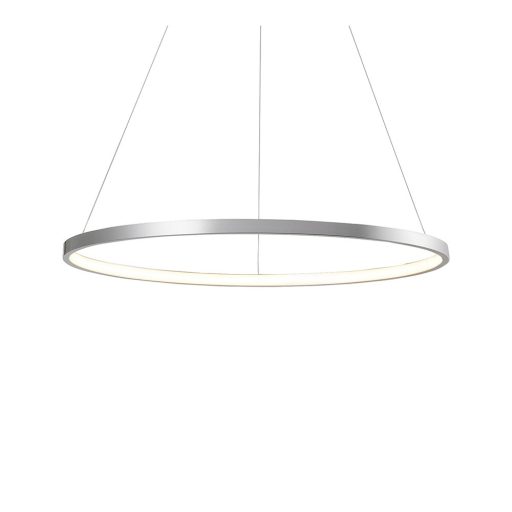Ezüst színű fém vázas függeszték gyűrű alakú búrával, beépített LED fényforrással.