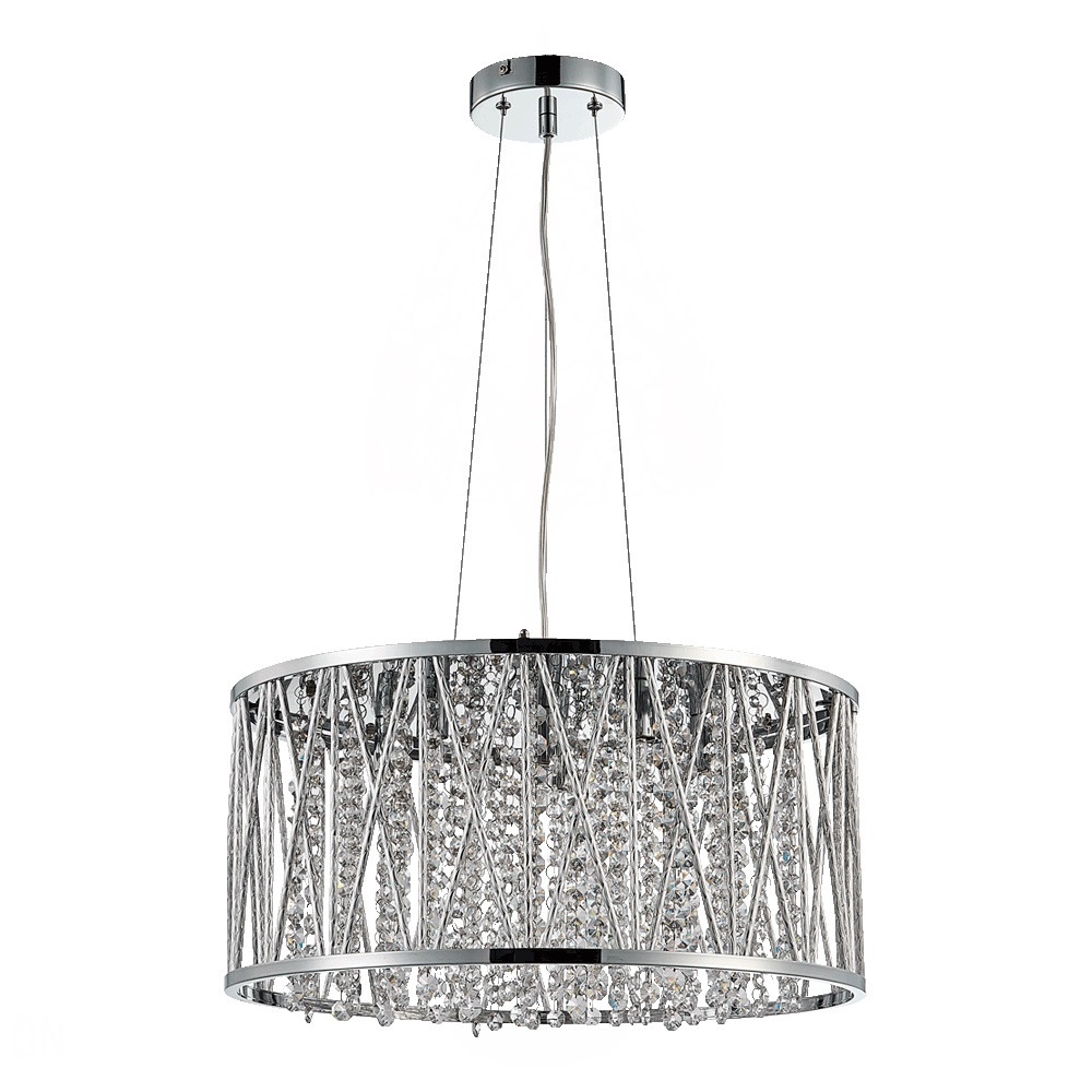 Króm színű fém vázas függesztett lámpa alumínium pálcikás, üveg kristály dekoros búrával, 6db G9-es foglalattal.