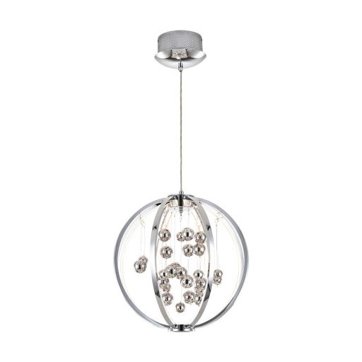 Modern stílusú függeszték, króm színű, gömb formájú fém/szilikon búrával, gömb dekorral, beépített LED fényforrással.