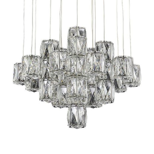 Fényűző megjelenésű króm színű fém vázas függeszték kirstály dekorral és beépített LED fényorrással.