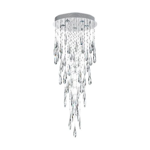 Fényűző megjelenésű, króm színű fém vázas mennyezeti lámpa csepp alakú kristály dekorral.