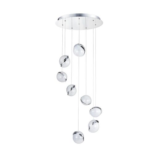 Design függeszték króm színű fém vázzal és gömb alakú, akril, kirstály effektes búrával, beépített LED fényforrással.