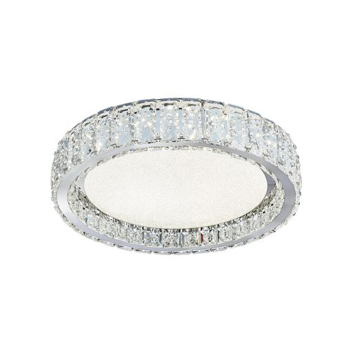Króm színű fém vázas kerek mennyezeti lámpa átlátszó üveg kristály búrával, természetes fehér színhőmérsékletű beépített LED fényforrással.