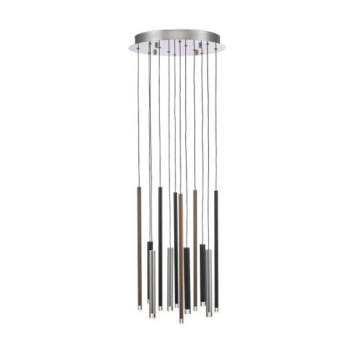 Design függeszték króm színű fém vázzal és ezüst, kávé és réz színű függő dekorral, beépített LED fényforrással.