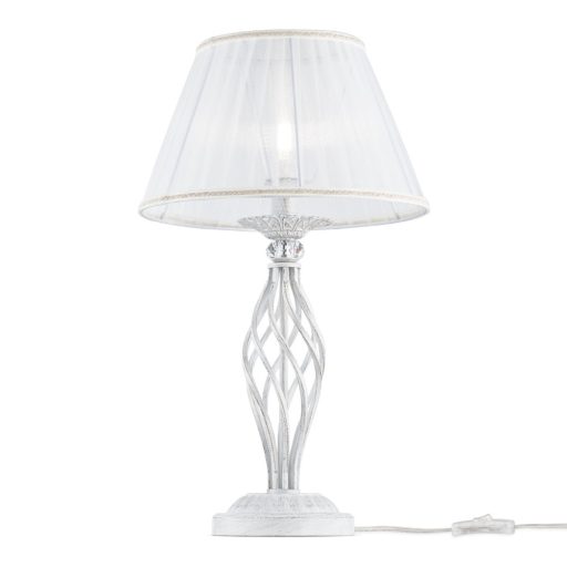 Antikolt fehér és arany színű fém vázas asztali lámpa fehér színű organza lámpaernyővel, a szárban kristály dekorral, E14-es foglalattal, vezetékre szerelt kapcsolóval. A lámpát fényforrás nélkül szállítjuk.
