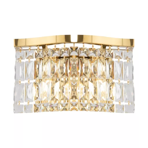 Arany színű fém vázas fali lámpa átltászó kristály búrával, 2db E14-es foglalattal. A lámpát fényforrás nélkül szállítjuk.