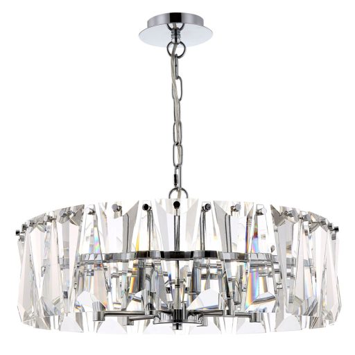 Króm színű fém vázas függeszték lámpa különleges formára vágott üveg kristály búrával, 6db E14-es foglalattal, rövidíthető belógással. A lámpát fényforrás nélkül szállítjuk.