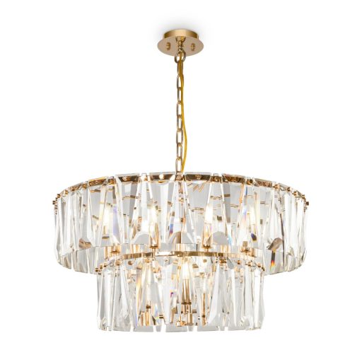Arany színű fém vázas függeszték lámpa különleges formára vágott üveg kristály búrával, 12db E14-es foglalattal, rövidíthető belógással. A lámpát fényforrás nélkül szállítjuk.