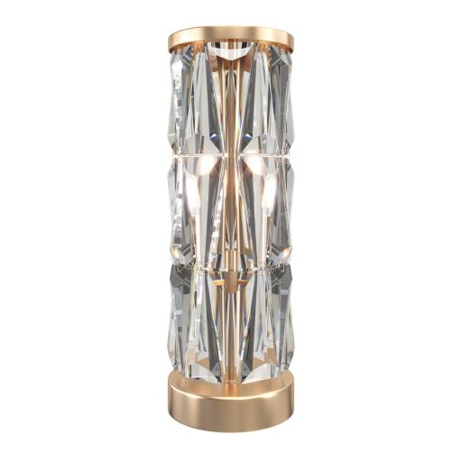Arany színű fém vázas asztali lámpa különleges formára vágott üveg kristály búrával, 2db E14-es foglalattal, vezetékre szerelt kapcsolóval. A lámpát fényforrás nélkül szállítjuk.