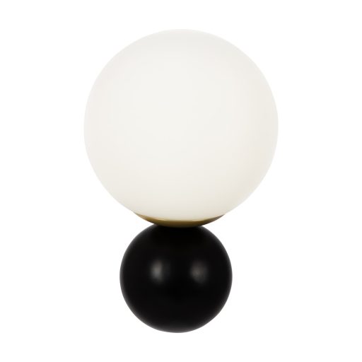 Fekete és matt arany színű fém vázas fali lámpa gömb alakú (15cm átmérőjű) súrolt üveg búrával, E14-es foglalattal. A lámpa fényforrást nem tartalmaz.