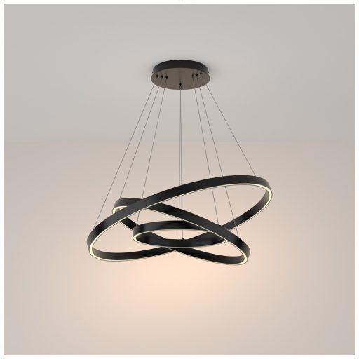 Fekete színű alumínium függeszék lámpa, gyűrű alakú búrával, meleg fehér színhőmérsékletű beépített LED fényforrással. A gyűrűk dőlésszöge tetszőlegesen állítható.