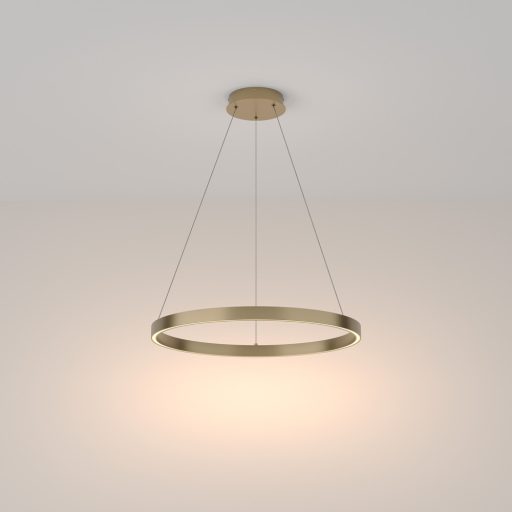 Sárgaréz színű alumínium függeszék lámpa, gyűrű alakú búrával, meleg fehér színhőmérsékletű beépített LED fényforrással.