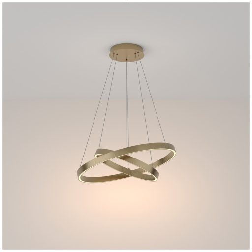 Sárgaréz színű alumínium függeszék lámpa, gyűrű alakú búrával, meleg fehér színhőmérsékletű beépített LED fényforrással. A gyűrűk dőlésszöge tetszőlegesen állítható.