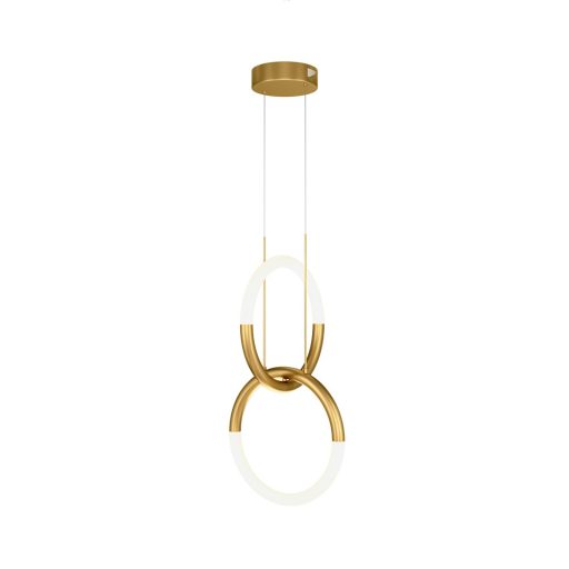 Arany színű fém függeszték lámpa gyűrű alakú, műanyag betétes búrával, beépített, meleg fehér színhőmérsékletű LED fényforrással, rövidíthető belógással.