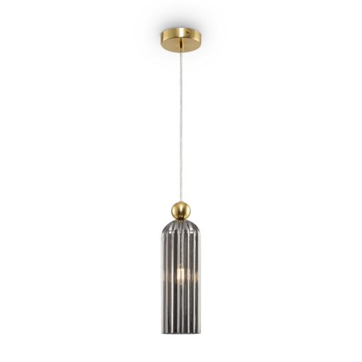 Sárgaréz színű fém vázas függeszték lámpa bordázott, áttetsző, füstszínű üveg búrával, E14-es foglalattal. A lámpa fényforrást nem tartalmaz.