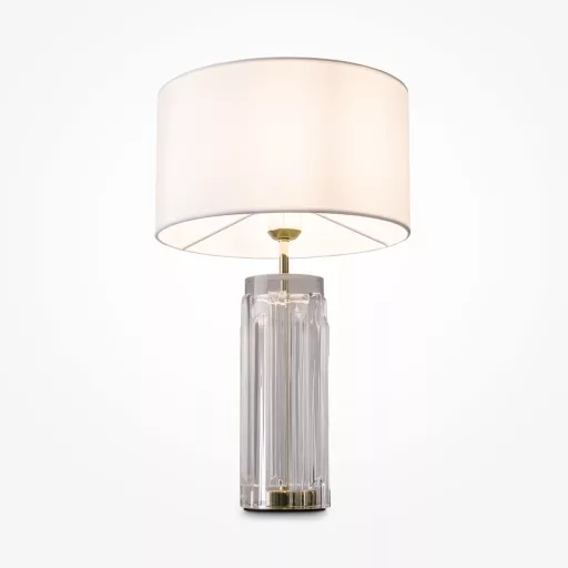 Arany színű fém vázas asztali lámpa átlátszó átlátszó üveg betéttel, fehér színű textil bevonatos lámpaernyővel, 1db E27-es foglalattal, vezetékre szerelt kapcsolóval. A lámpát fényforrás nélkül szállítjuk.