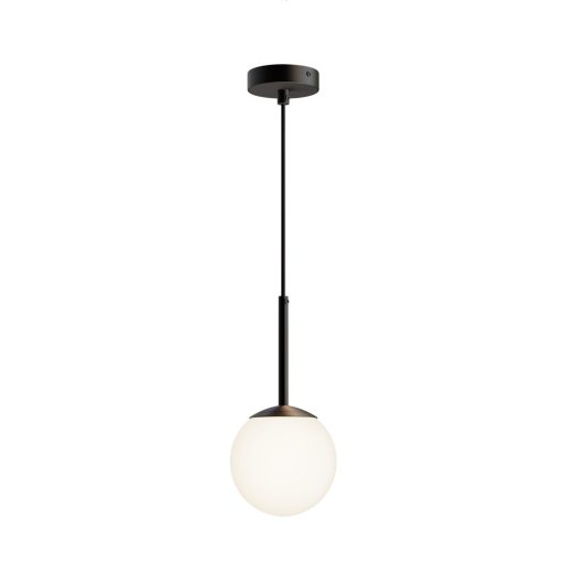 Fekete színű fém vázas, minimál stílusú függeszték lámpa gömb alakú, 15cm átmérőjű fagyasztott üveg búrával, E14-es foglalattal, rövidíthető belógással. Fényforrást nem tartalmaz.